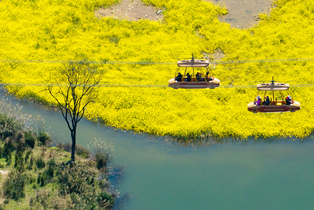 This year, the scenic area upgraded its 10-kilometer (6.2-mile) cable car loop into a spring sightseeing route, offering visitors views of the flower fields and rural landscape from above.