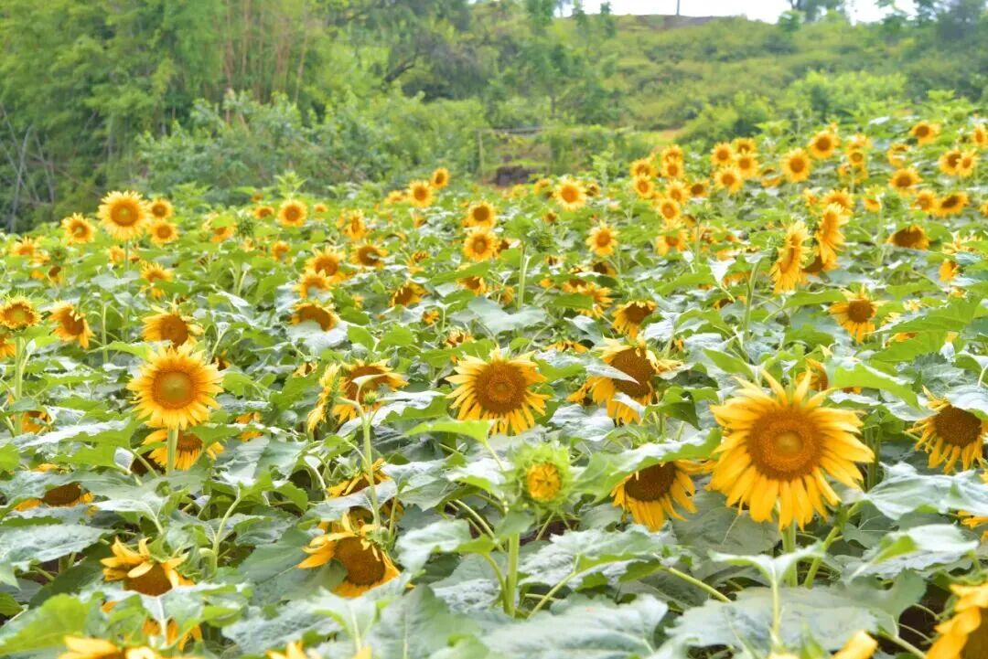 Sunflower fields also appear in the surrounding countryside during early summer. In Shengquan Subdistrict of Jiangjin District, hillsides near the village of Ma’anshi are covered with bright sunflowers facing the sun, with distant mountains forming a scenic backdrop.