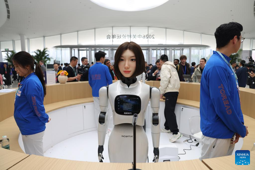 Guests interact with a humanoid robot at the Zhongguancun International Innovation Center in Beijing, capital of China, March 25, 2026. The 2026 Zhongguancun Forum runs from March 25 to 29 under the theme "Full Integration Between Technological and Industrial Innovation." (Photo/Jin Liwang)