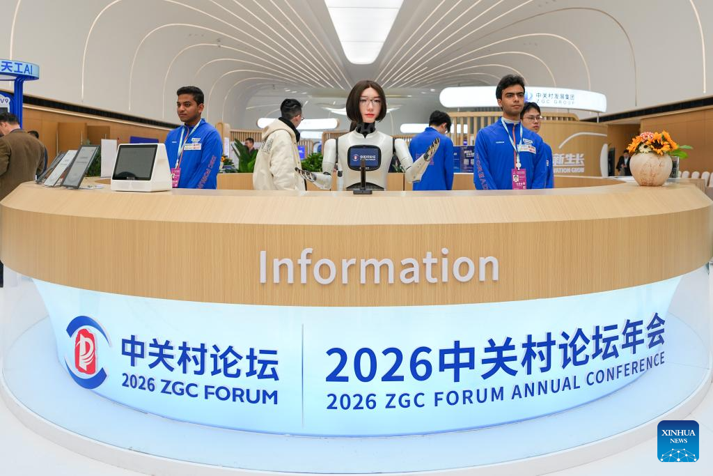 A humanoid robot greets guests at the Zhongguancun International Innovation Center in Beijing, capital of China, March 25, 2026. The 2026 Zhongguancun Forum runs from March 25 to 29 under the theme "Full Integration Between Technological and Industrial Innovation." (Photo/Ju Huanzong)