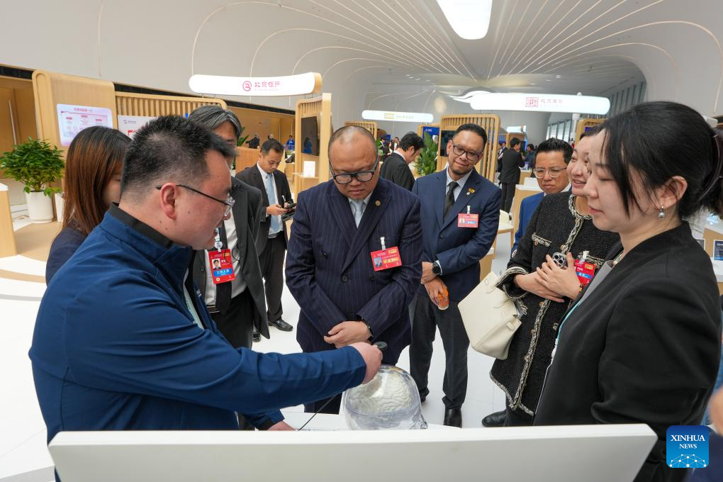 Guests learn about an intelligent brain-machine interface system at the Zhongguancun International Innovation Center in Beijing, capital of China, March 25, 2026. The 2026 Zhongguancun Forum runs from March 25 to 29 under the theme "Full Integration Between Technological and Industrial Innovation." (Photo/Ju Huanzong)