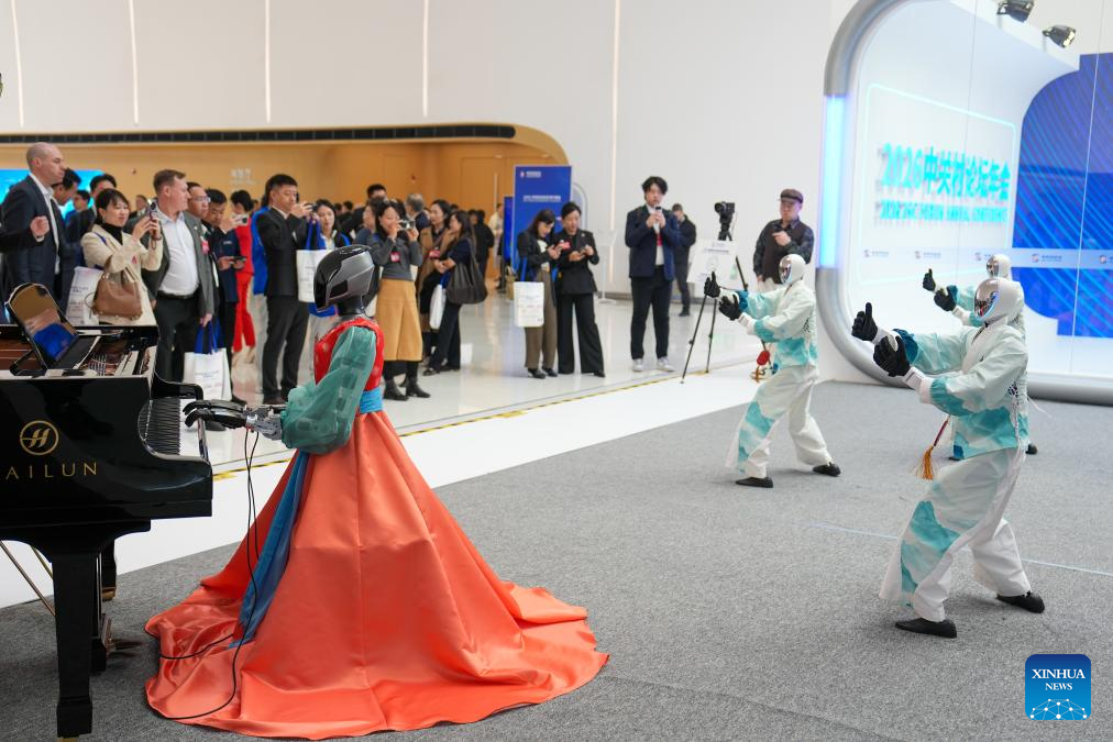 Humanoid robots play the musical instruments and dance at the Zhongguancun International Innovation Center in Beijing, capital of China, March 25, 2026. The 2026 Zhongguancun Forum runs from March 25 to 29 under the theme "Full Integration Between Technological and Industrial Innovation." (Photo/Ju Huanzong)