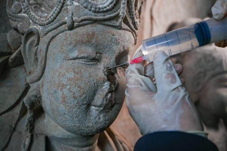 But the patient is neither human nor animal. It is a stone statue at the Dazu Rock Carvings, a UNESCO World Heritage Site in southwestern China. And the surgeons are members of the Conservation and Restoration Team at the Dazu Rock Carvings Research Institute - often called the “imperial physicians” of these ancient treasures.