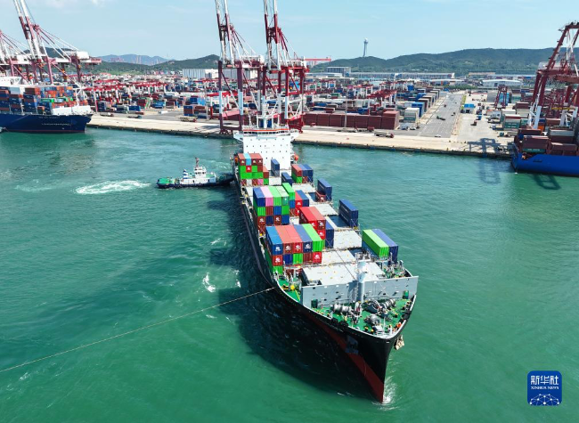 A cargo ship slowly departs from the bustling Qingdao Port in Shandong.(Photo/Xinhua)