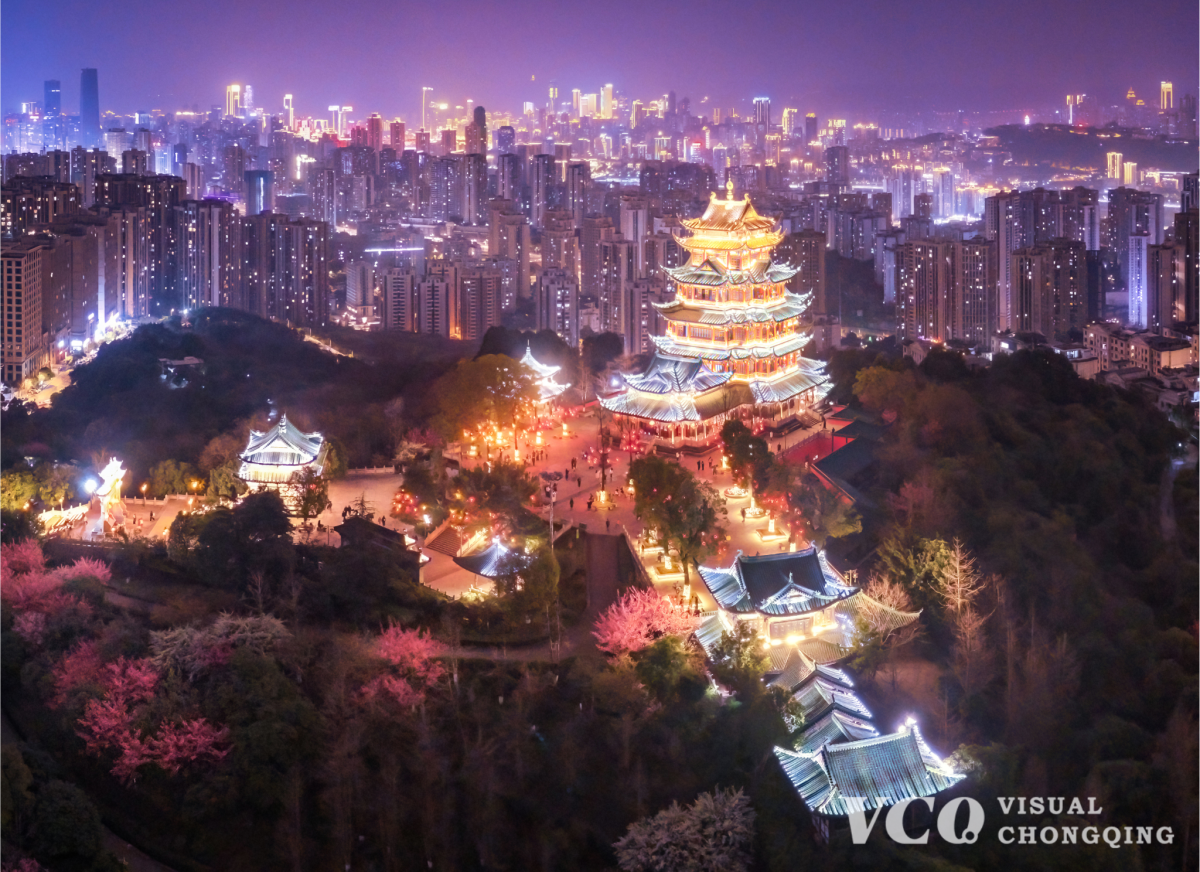 Hong'en Temple Forest Park comes alive at night, its vibrant lights complemented by the delicate blooms of red plum blossoms. (Photo/Qu Xiaofeng from Visual Chongqing)