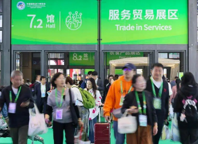This photo shows the Trade in Services Exhibition area during the eighth China International Import Expo (CIIE) in east China's Shanghai, Nov. 9, 2025. (Photo/Wang Xiang)