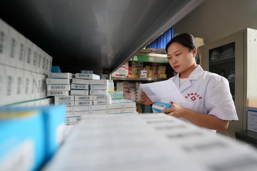 The pharmacy staff of the health center are fetching medicine for the patients. (Photo/Xinhua)