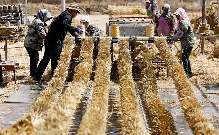 People make straw ropes at Heilin Village in Zhongwei, northwest China's Ningxia Hui Autonomous Region, April 10, 2026. (Photo/Wang Peng)