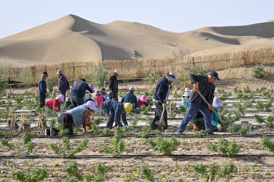 Villagers plant Belamcanda chinensis, a plant used in traditional Chinese medicine, at a garden in Yutian County, northwest China's Xinjiang Uygur Autonomous Region, April 15, 2026. From medicinal plants to flourishing fruit orchards, these green barriers are not only curbing desertification of Taklimakan Desert but also invigorating local industries. (Photo/Ding Lei)