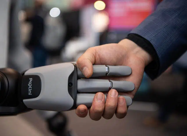 A man shakes hands with a humanoid robot from PaXini at the Hannover Messe 2026 in Hannover, Germany, April 21, 2026. Hannover Messe 2026, Germany's flagship industrial trade fair, opened on Monday with industrial artificial intelligence (AI) and humanoid robots taking center stage for the first time. (Photo/Zhang Haofu)