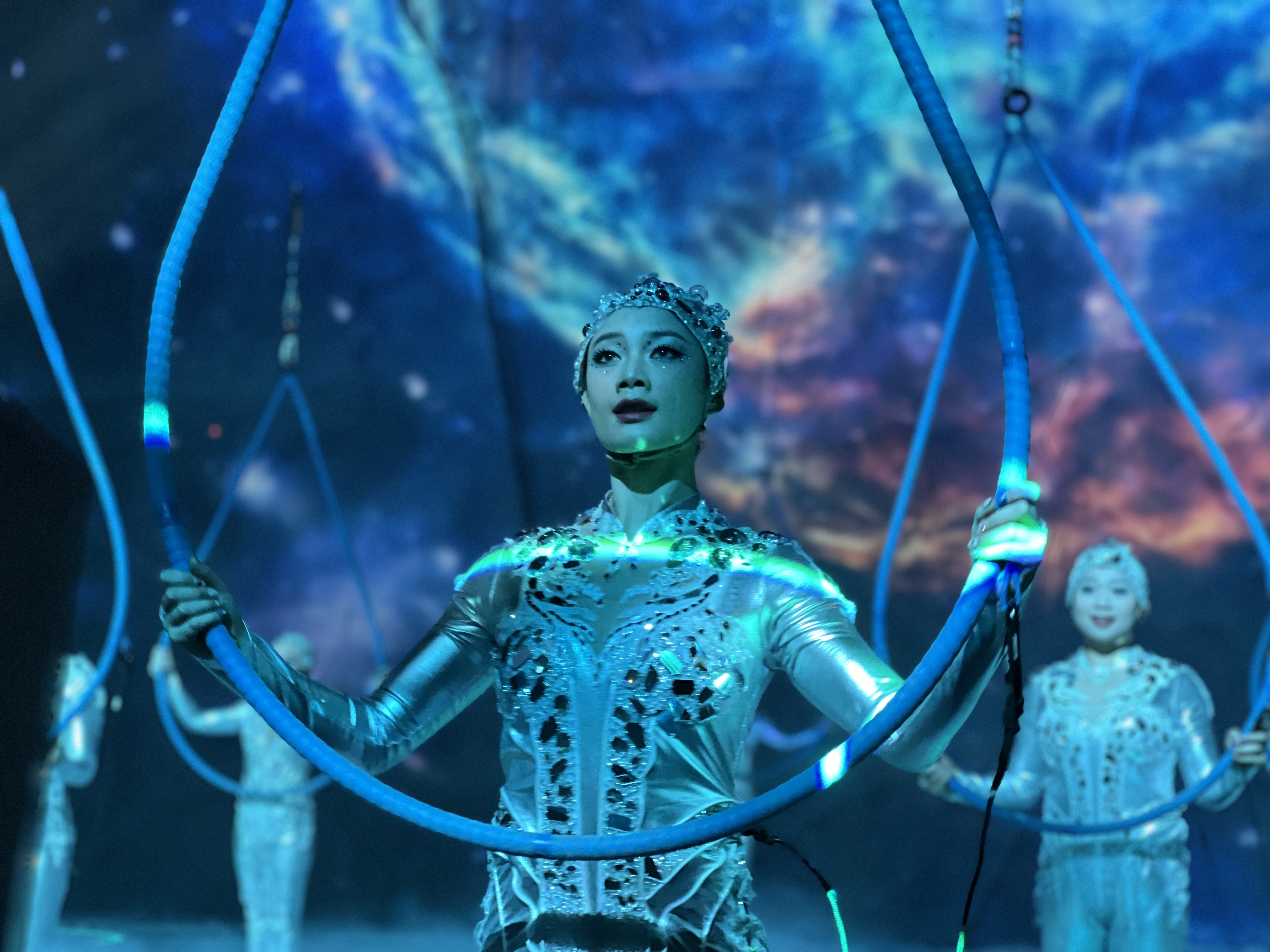 Above the stage, 16 wire‑flying machines have been installed, allowing 16 female performers to embody "water droplets" in the air, accompanied by giant water‑drop installations. Irregular rings, triangular magic cubes, and other creative props add to the visual richness, capturing both the grandeur and the delicate beauty of the Yangtze.