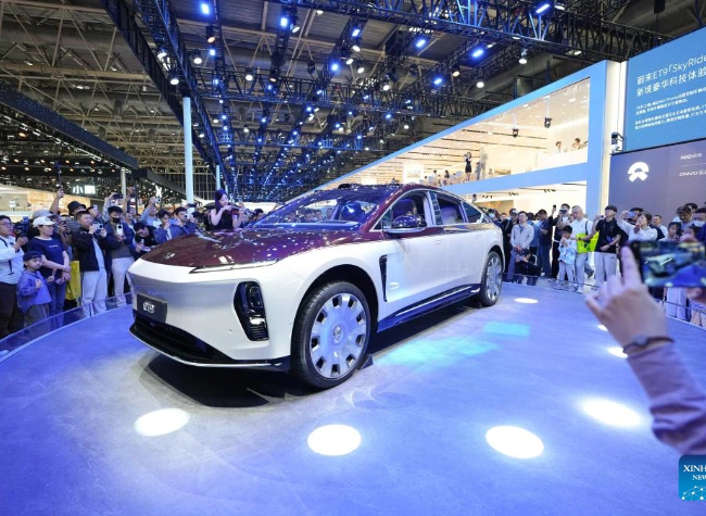 Visitors learn about the full active suspension system of the NIO ET9 during the 2026 Beijing International Automotive Exhibition in Beijing, capital of China, April 26, 2026. The 2026 Beijing International Automotive Exhibition, which kicked off here on Friday, opens for professional visitors from April 26 to 27. The show in China's capital city has set a new global record for scale, spanning 380,000 square meters across two venues, with 1,451 vehicles on display -- 181 of them premieres and 71 concept cars. (Photo/Ju Huanzong)