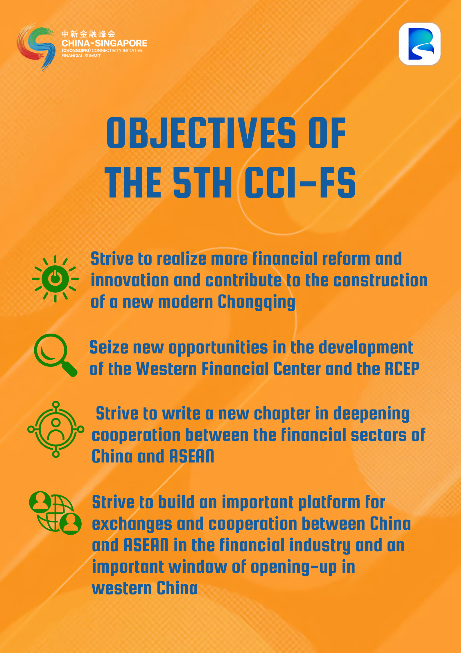 Since 2018, the China-Singapore (Chongqing) Connectivity Initiative Financial Summit (CCI-FS) has been successfully held for four years. It has emerged as a platform for exchange and cooperation in financial industries between China and ASEAN, serving as an important window for opening up to the world in western China and a key symbol of Chongqing's financial opening-up and development.